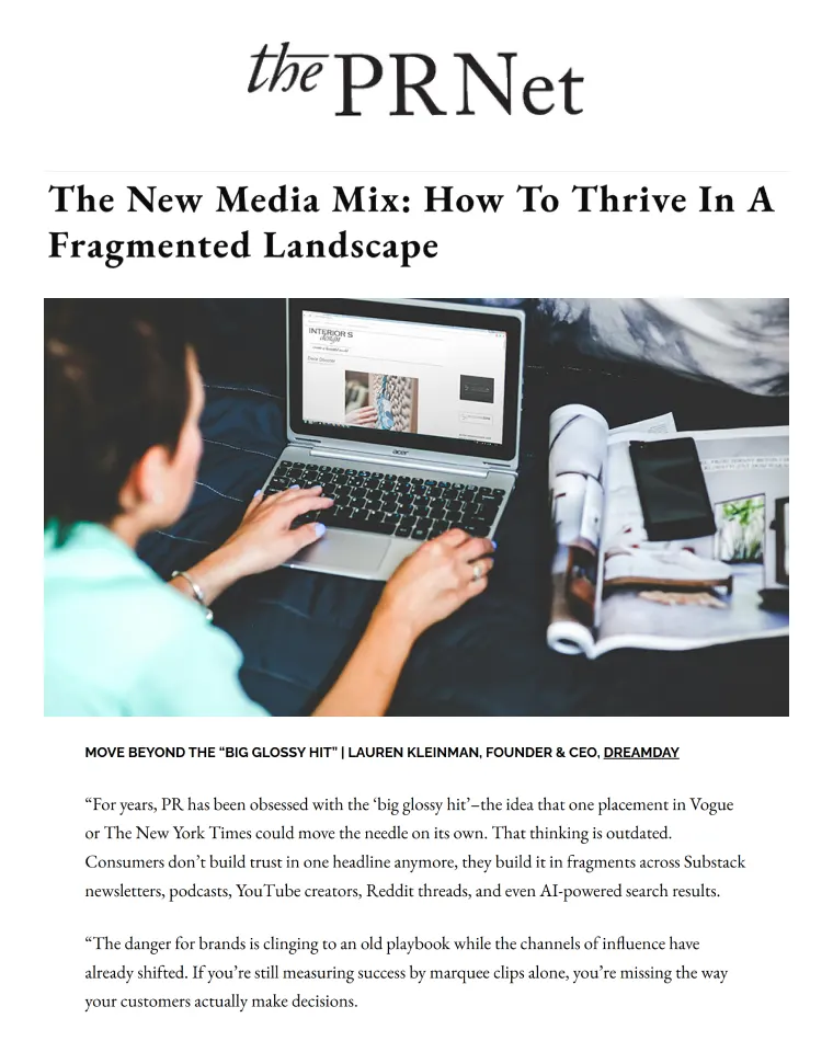 "Dreamday is the only PR agency I’ve worked with that truly considers the business value behind the headlines. They understand the future of PR and how it’s evolving beyond editorial, and they’re helping reframe PR as a revenue-building tool rather than just a brand-building tool."